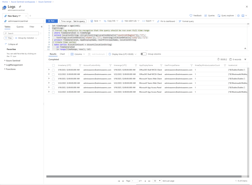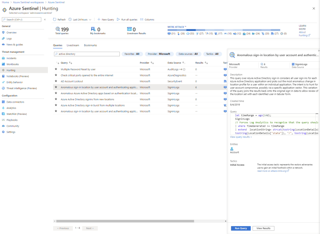 The Hunting page allows us to user pre-created or custom queries to search for particular behaviour in our environment. For example, looking at Azure AD related activities, we can very quickly use the “Anomalous sign-in location by user account and authenticating application” to query anomalous sign-in attempts in Azure AD.