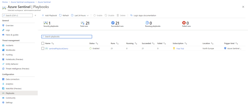 When you’ve created and customized your playbook, hit save and head back to the Playbooks section of Azure Sentinel where you will see the new playbook.