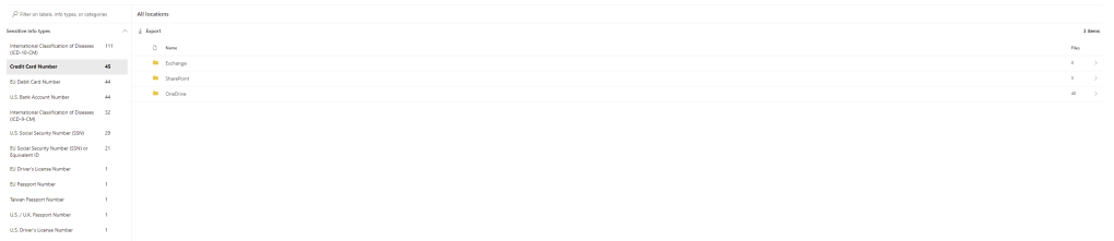 To get insights into the data in the organization without relying on labelling, we can use the “Content Explorer” tab. From here we can view both labels and sensitive information types by location, drilling down to individual items. To use the content explorer, the “Content Explorer List Viewer” or “Content Explorer Content Viewer” are required to view a summary of results or details respectively.