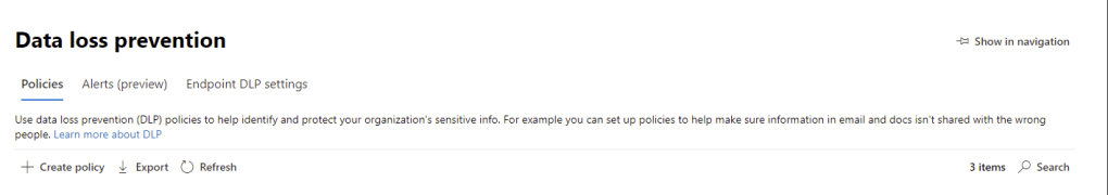 To get started creating a DLP policy, open up the Microsoft 365 Compliance Center and navigate to “Solutions” -> “Data Loss Prevention”. On the Data Loss Prevention page, select “Create Policy”.