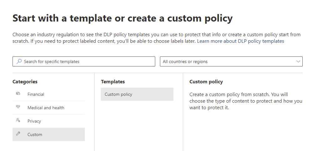 First we need to choose what content we want to protect. We can use the procreated Microsoft Policy Templates which contain set’s of sensitive information types based on the type of data we want to protect or we can use a custom policy to define this ourselves. For our policy, let’s select a custom policy.