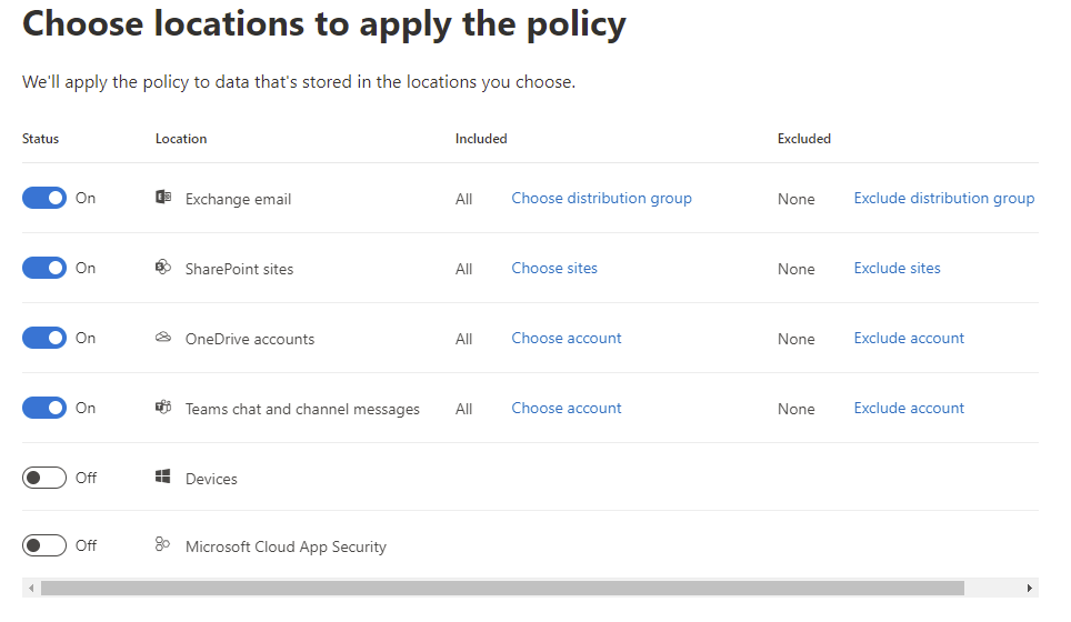 We can leave the default values to include all sites, users, accounts or Teams. Here we could target the policy or exclude certain objects.