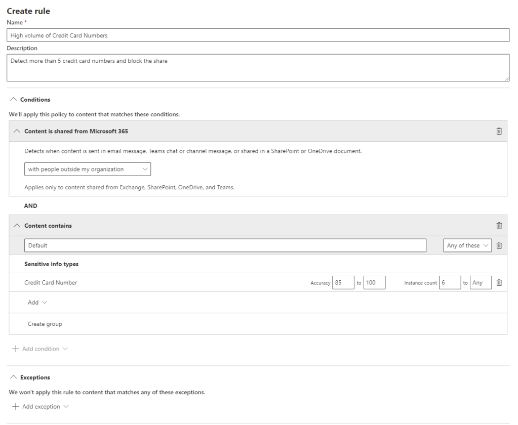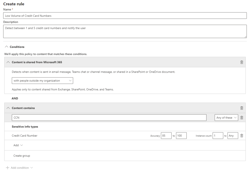 - Content Contains – When particular data is located in the content that is shared. Multiple sensitive information types can be specified using the group function here. We can also specify the accuracy range of each sensitive information type and the count of instances we want to trigger this rule for. For example, when we detect between one and five instances of a particular sensitive information type, we can take a warning action however when there are more than five, we can trigger a full block