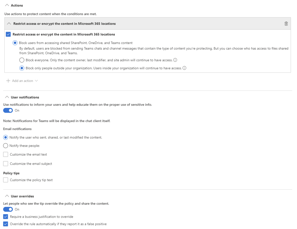 - User Overrides – Configure if the user can override the policy, the user can be given a policy tip to override or we can automatically override if the user flags it as a false positive. We can also choose to require a business justification if the user chooses to override the policy