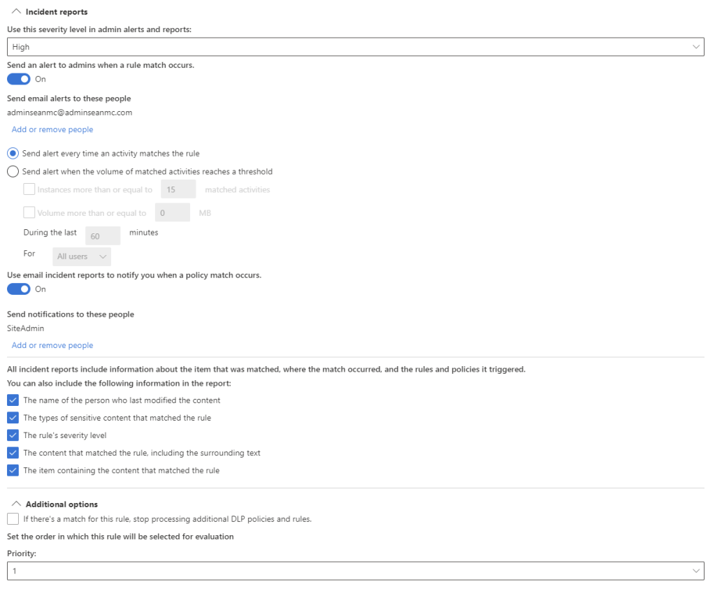 - incident Reports – Configure the severity level and alert recipients when this rule is matched. We can also choose what information to include in the alerts/reports