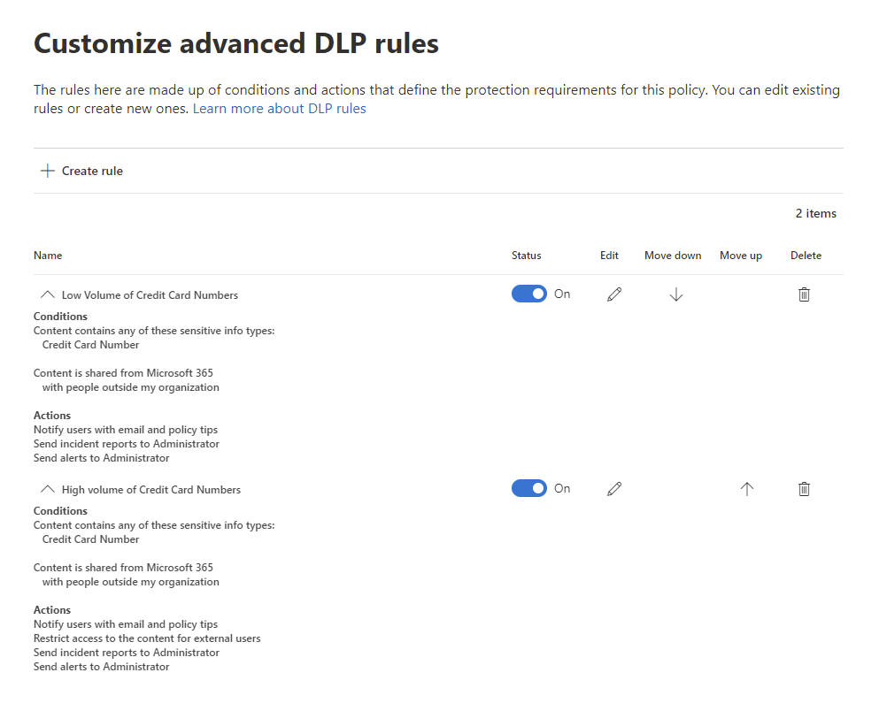 This rule will detect between one and five occurrences of Credit Card Numbers in a document, email or message, notify the user and also send an alert and report with low severity to the admin.