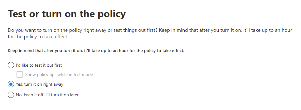 On the next page we can choose to turn on the policy immediately, run it in a test mode which will generate logs or turn it off for now. I very much recommend using the testing functionality in a production environment but to save time, we’ll just enable our policy for now.