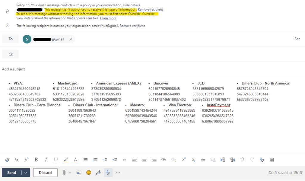 Now when users attempt to send email or share documents externally, if there are credit card numbers detected in the content, the user will be met with out configured response.