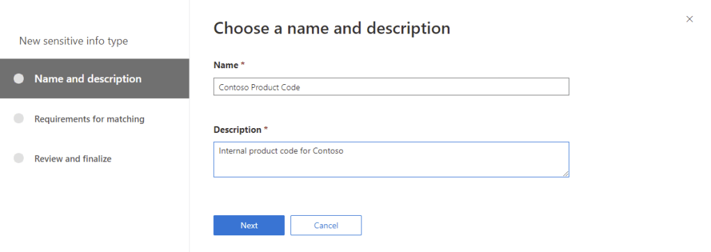When we created our policy above, we used the Sensitive Information Type for Credit Card Numbers to identify our content. We’ve also seen Sensitive Information Types when we looked at Sensitivity Labels. Microsoft have created a wide range of Sensitive Information Types (detailed here) that we can use out of the box, however there are usually business cases for protecting sensitive data that don’t fit with the predefined types available (for example, internal product codes). Luckily, for this scenario, we can build out our own information types to target this data.