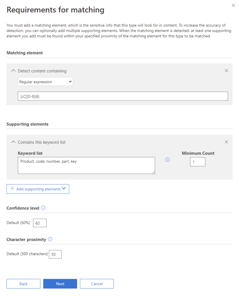 In the below example, we will take a company product code which is the letter “C” followed by six digits (for example “C123456”). We also have supporting elements from a keyword list that we expect within 50 characters of the information type.
