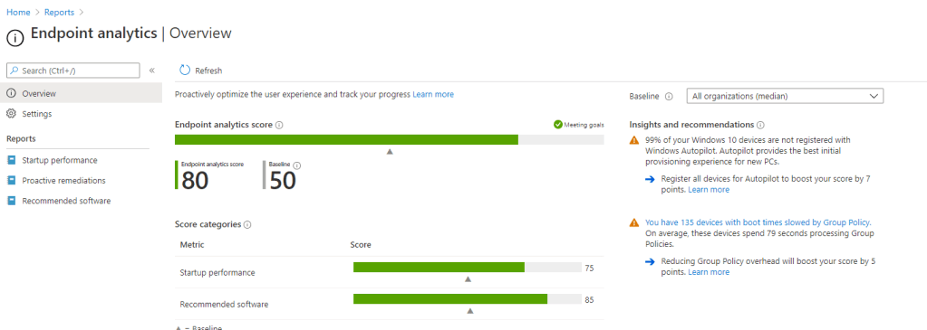 - Endpoint Analytics – This report shows us a breakdown of the analytics and metrics gathered from our devices. Providing insight into improvements that can be made where issues may be occurring