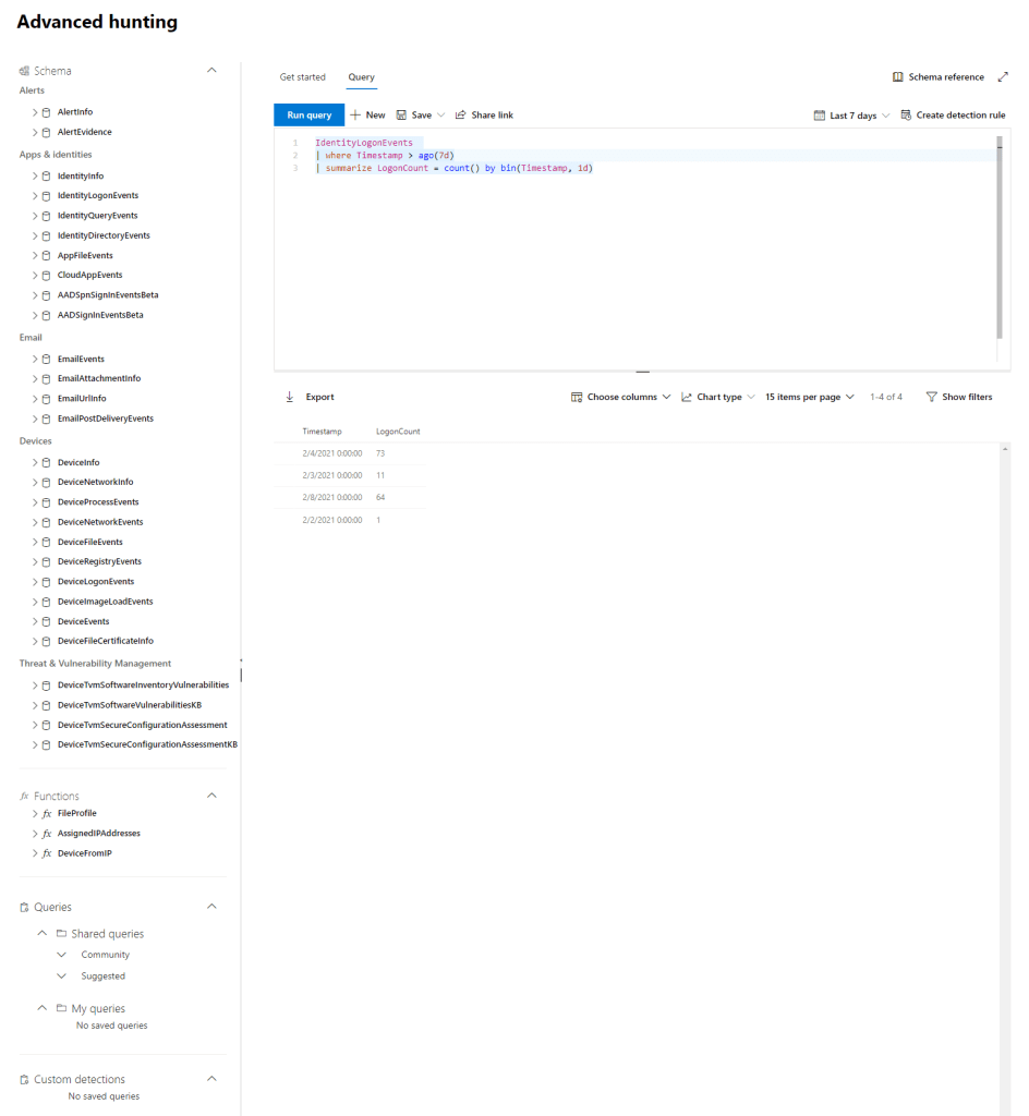 We can also identify behaviour and trends in our environment by using the Advanced Hunting functionality, querying and resolving data from multiple sources across our tenancy, similar to the functionality in MCAS. Advanced Hunting is based on KQL, a reference for using KQL can be found here.