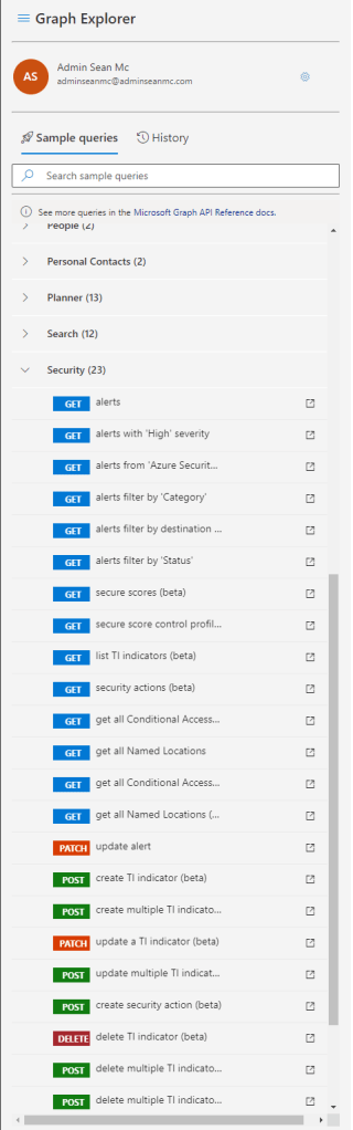 Once signed in, scroll down the sample queries pane to the Security section. This section contains a subset of the available Security Graph queries available.