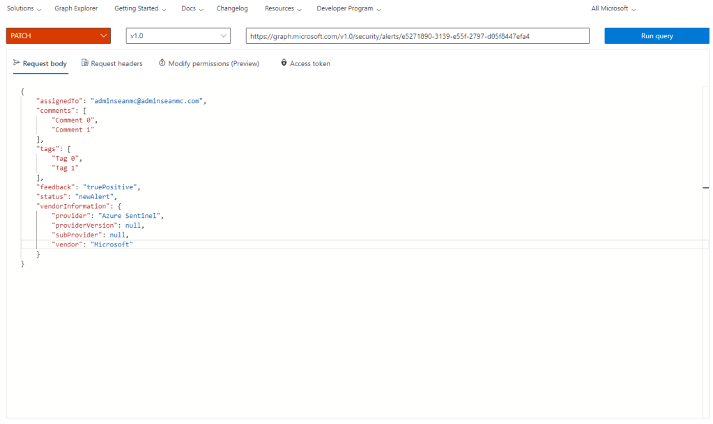 To update a specific alert, we need to replace the {alert-id} value with the ID of the alert we are querying. If we take the ID from the first alert that showed up in our results above, we can use the “Request Body” pane to update the alert, in the below example, we are assigning the alert to “adminseanmc@adminseanmc.com”.