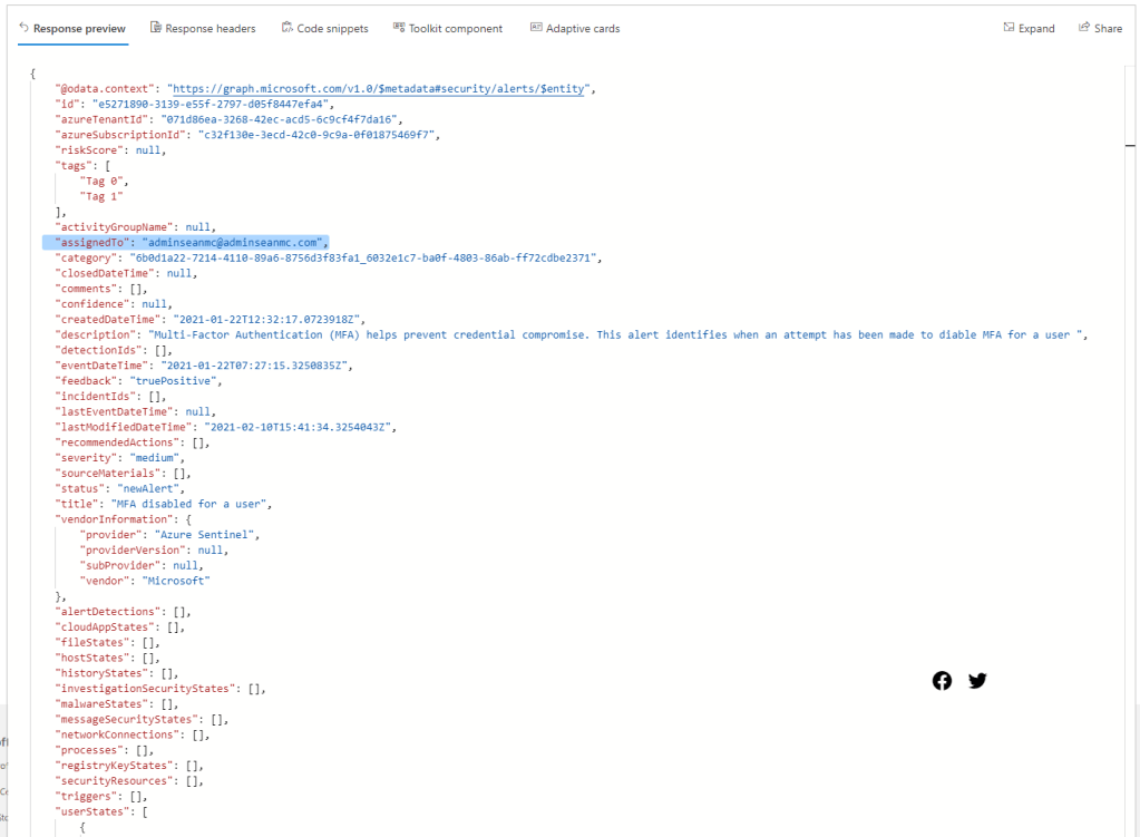 Running the above query will update the assigned user in the Security Alert. We can then run the following “GET” query to return the details of the alert where we can see the updated “assignedTo” attribute.