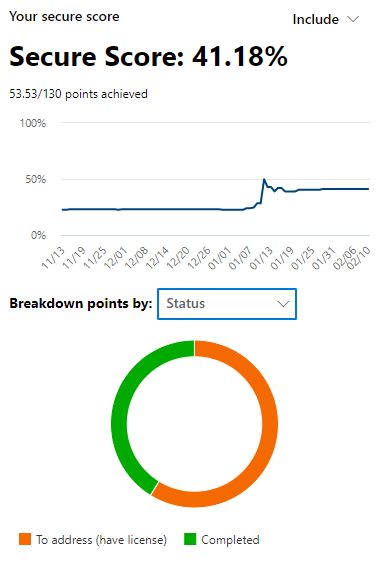 On this page we can see a lot of data in a single pane. Our Secure Score in itself, is the calculated score based on the features and controls we have enabled in our environment. This can be broken down by category or status.
