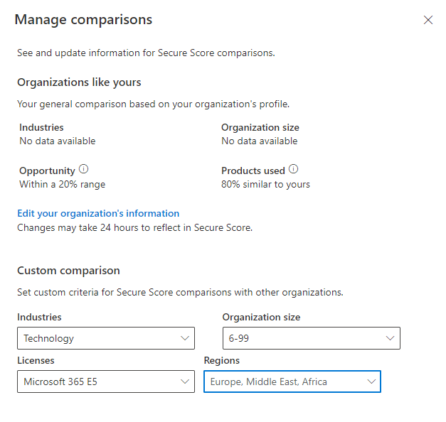 To ensure this is accurate, make sure to click “Manage Comparisons and update the organization information to reflect the organizations industry, size, license type and region.