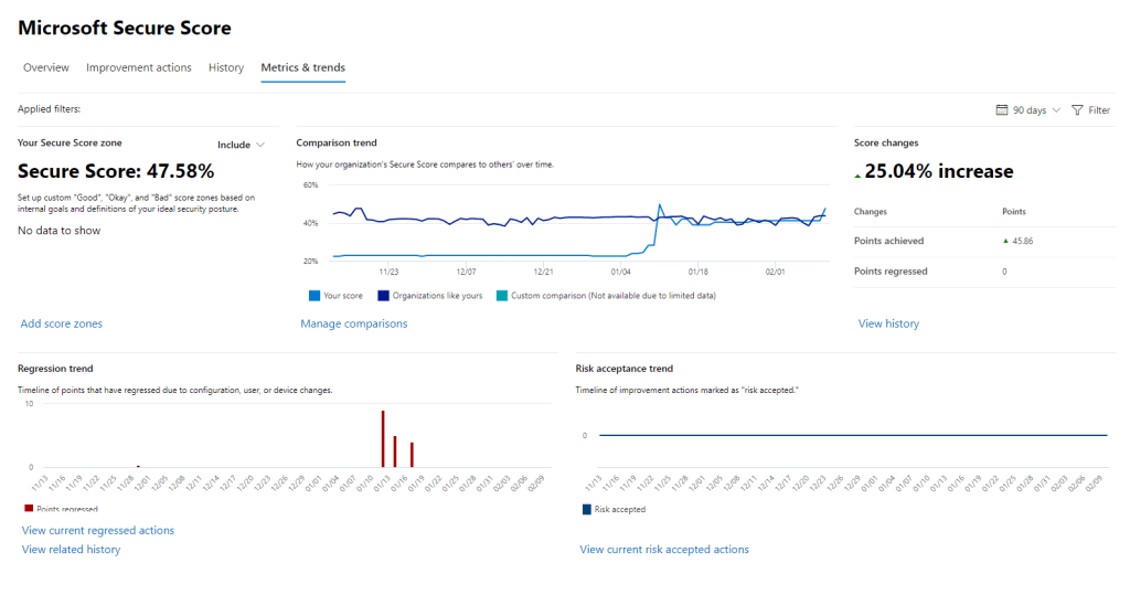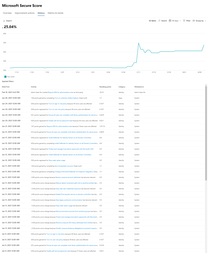Next, we can see the history of our Secure Score, this shows us the changes that have been made over time and how they have affected our score. This can be a great graph to show the evolution of the tenant from a security perspective.