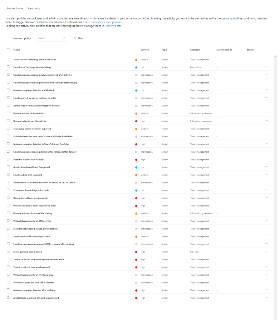 To create an alert policy, open up the “Policies & Rules” -> “Alert Policy” section of the Security Center. Here we will se a list of all the active alert policies in our organization.