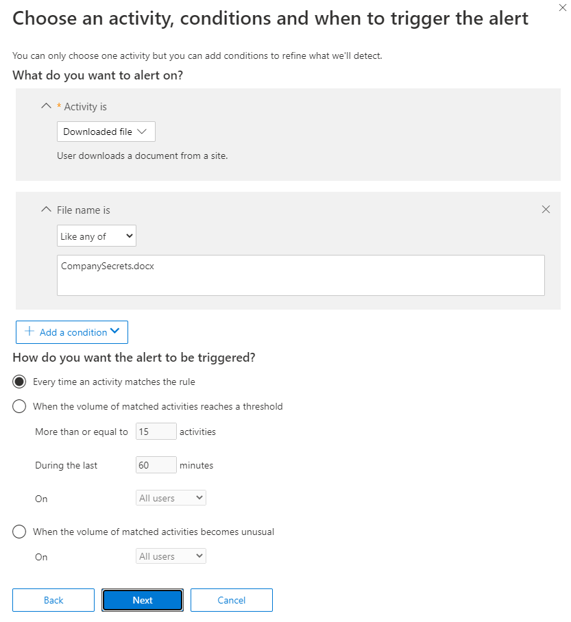 To create a custom policy, click the “New Alert Policy” button. For this example, let’s say we want to create an alert for whenever someone downloads a particular file that contains sensitive information named “CompanySecrets.docx.