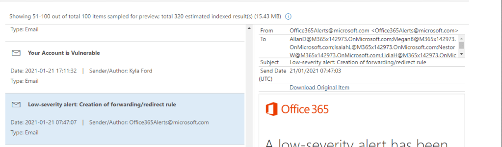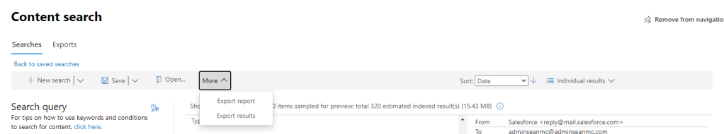 When the search completes, you will be presented with the results in preview, from the “More” dropdown we can export a report of the search results or the entire contents of the search.