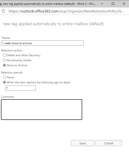 With an archive enabled, a user can start moving content to the archive which is mapped in Outlook. We can also configure Retention Tags to automatically archive mail data. Retention Tags contain rules and are assigned in Outlook to retain, delete or archive mailbox data, Retention Policies are used to make Tags available to users. This can be done by opening the “Compliance Management” -> “Retention Tags” section of the Exchange Online Admin Center and clicking the “+” to create a new tag.