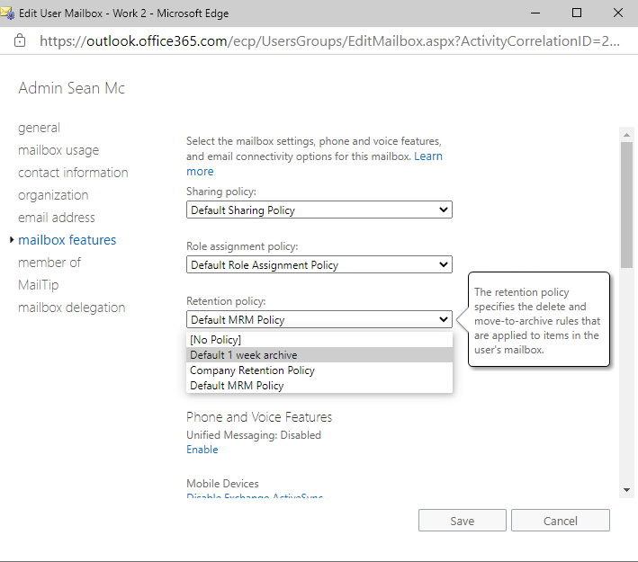 When the policy is saved, we can change the policy assigned to a user in the users mailbox features under “Retention Policy”