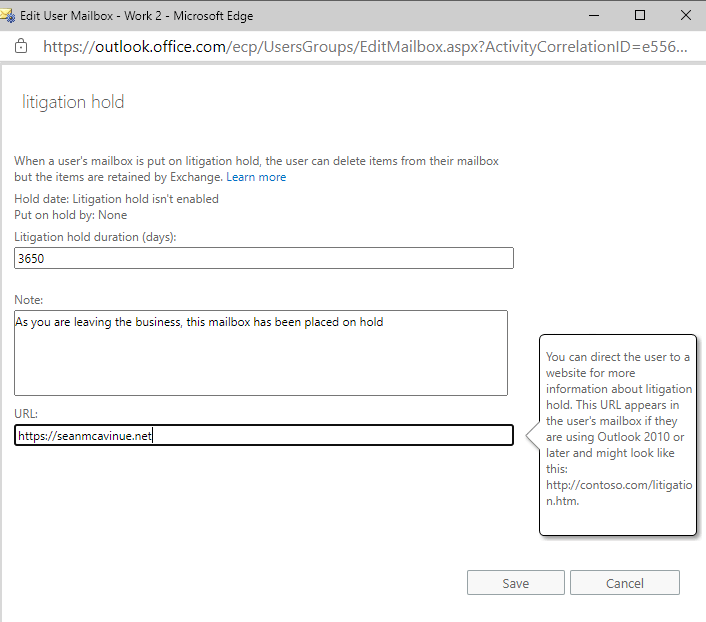 Inactive Mailboxes in Microsoft 365 allow us to retain data after a user has left the organization while freeing up the license assigned. This is generally used as part of a leavers process or to retain data for a period of extended leave. To make a mailbox inactive, it must be either placed on Litigation Hold or have an appropriate retention policy applied. We have already looked at Retention Policies so for this example we will put a mailbox on Litigation Hold. To do this, we can either select the mailbox in the Exchange Online Admin Center and under “Mailbox Features” enable Litigation Hold.