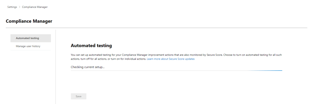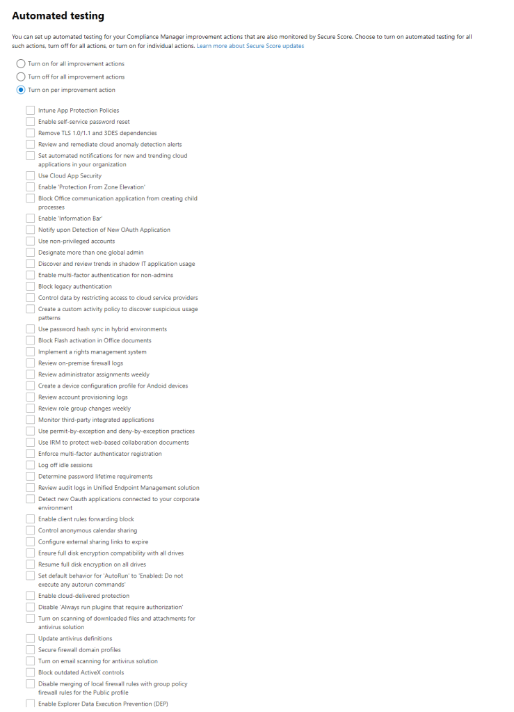 In this section, we have two areas we can configure. The first is the “Automated Testing” settings which allows us to control is Microsoft 365 will assess improvement actions automatically to determine if they are completed or outstanding. We can set this to: