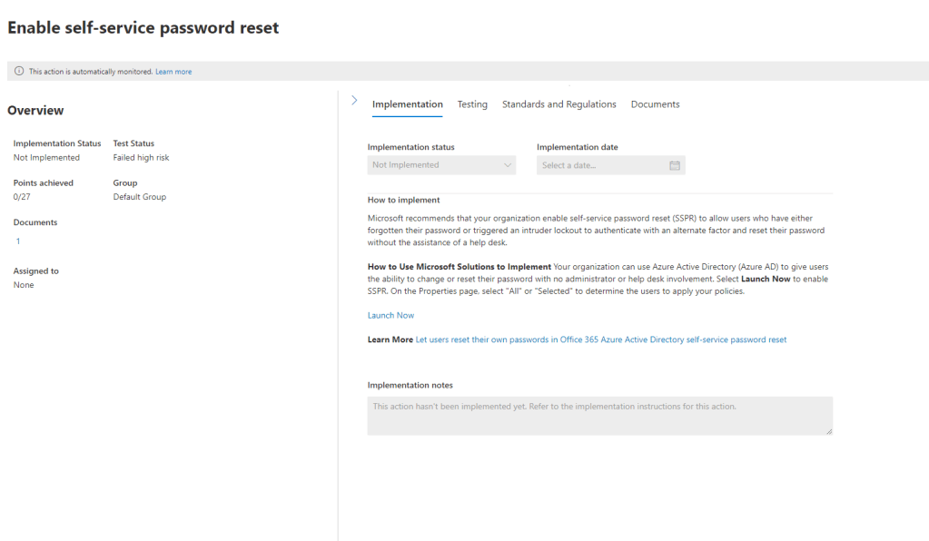 We can use the filters at the top of the page to narrow down the are or status of a particular action and then click on it to see more detail about it. Below we can see the action item for Enabling Self-Service Password Reset.