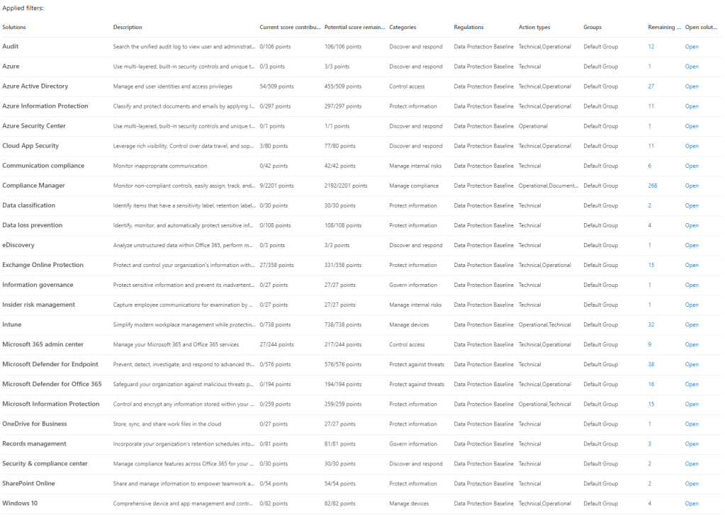 Select the “Open” option beside each one to navigate to the respective Admin Center for that tool while clicking on the “Remaining Actions” column, will navigate back to the Improvement Actions page with a filter in place for the specific solution you selected.