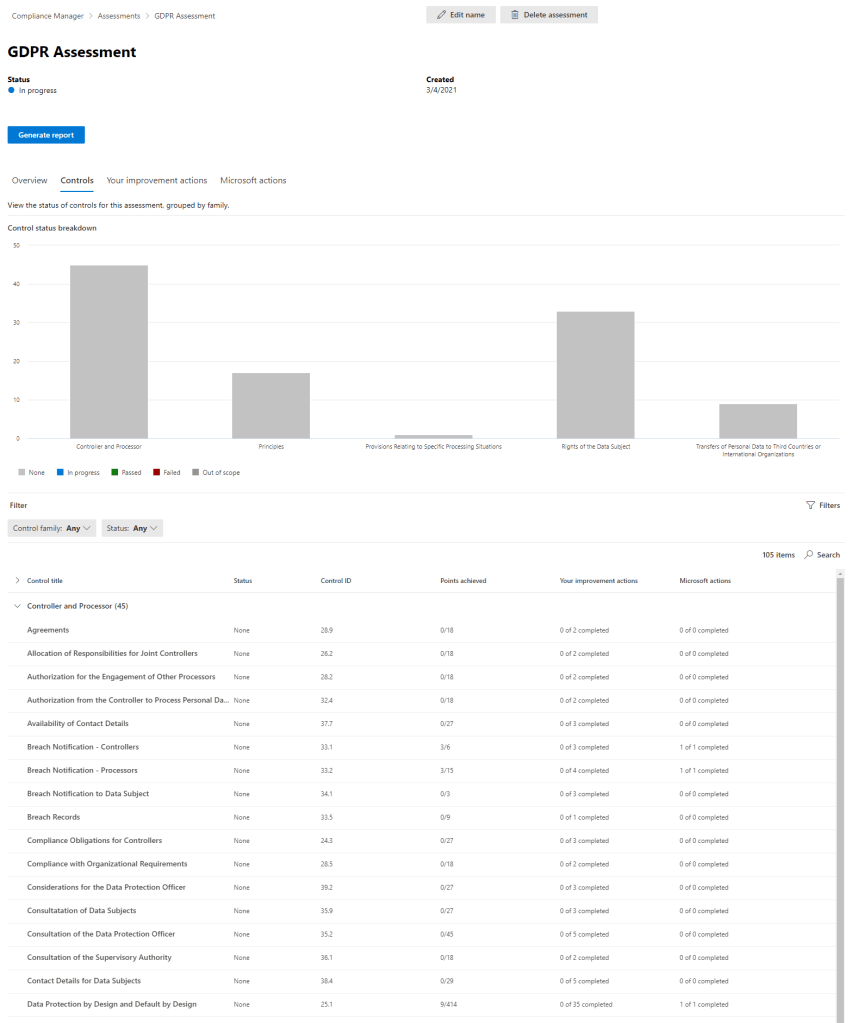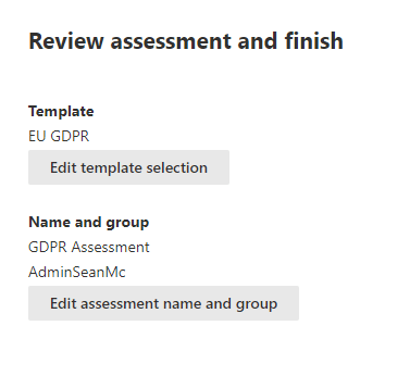 We can use assessments in Compliance Manager to compare our configuration against a host of preconfigured baselines. This works great as a validation tool and for gap analysis. To create an assessment, navigate to the “Assessments” tab of Compliance Manager and select “Add Assessment”. On the first page, select a template baseline to include, for this example, we’ll select EU GDPR but there are a wide range to choose from.
