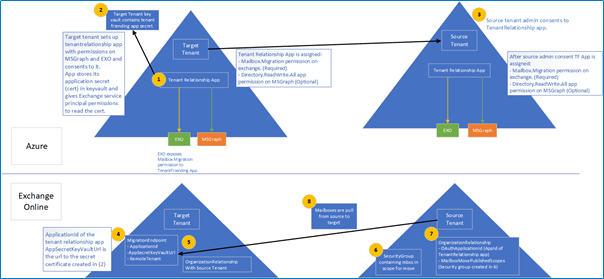 The process of cross-tenant mailbox migration is detailed in my previous post and on in the Microsoft documentation here and summarized in the below diagram.