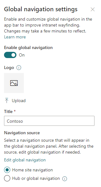 Enable the Global Navigation toggle and configure the settings with an optional logo, a Company name and then choose whether to use the navigation of the Home Site or to use a Hub or custom Global Navigation (More information on this here). If we choose to use Hub or Global Navigation, we can use the “Edit Global Navigation” option to configure this.