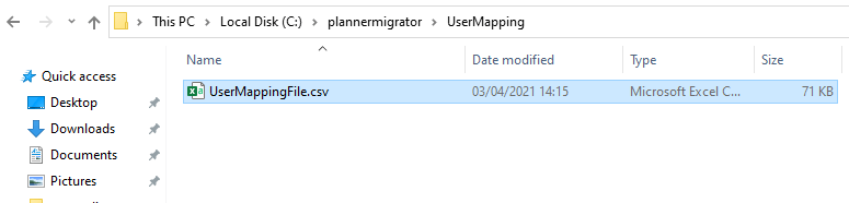 If we plan to reassign tasks in the destination we need to provide a mapping file. This file allows us to link a source user account to the same user on the destination. The user mapping file is located in “PlannerMigrator\UserMapping\UserMappingFile.csv”.