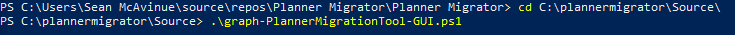 With everything in place, we can now run the migration tool. Open up PowerShell and navigate to the source folder “C:\plannermigrator\Source”. From here run the command “.\graph-PlannerMigrationTool-GUI.ps1” to start the tool.