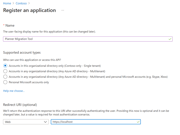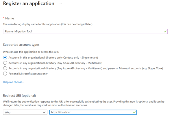From the Azure Active Directory portal, create a new Application Registration, give it a descriptive name and endure the Redirect URI is set to “https://localhost”. Note that the permissions are slightly different for the destination as we need to be able to write to the Group/Plan, not just read.
