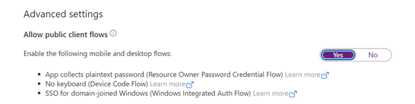 Finally, on the “Authentication” blade, enable the option to “Allow public client flows”.