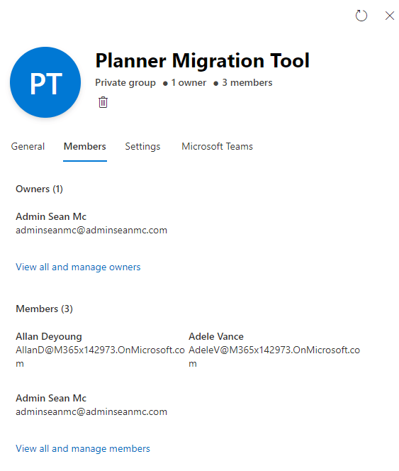 As a Plan is created as a component of an Office 365 Group, the user account being used to migrate must be an owner and member of any Office 365 groups containing plans that need to be migrated. The below group is the container for the plan we will be migrating