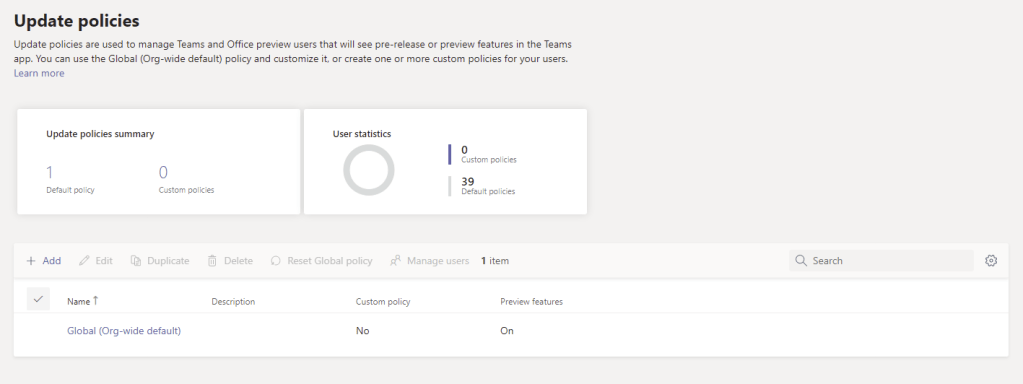 To enable preview features, we need to configure the Teams Update Policy for the users we want to allow. To do this, jump over to the Teams Admin Center and open up “Teams” -> “Update Policies”. For most tenants, there will be a single “Global” policy listed here.