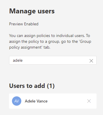 With the policy created, we just need to add it for our users that we are enabling the Preview option for. Do this by clicking “Manage Users” and adding the user(s) we want.