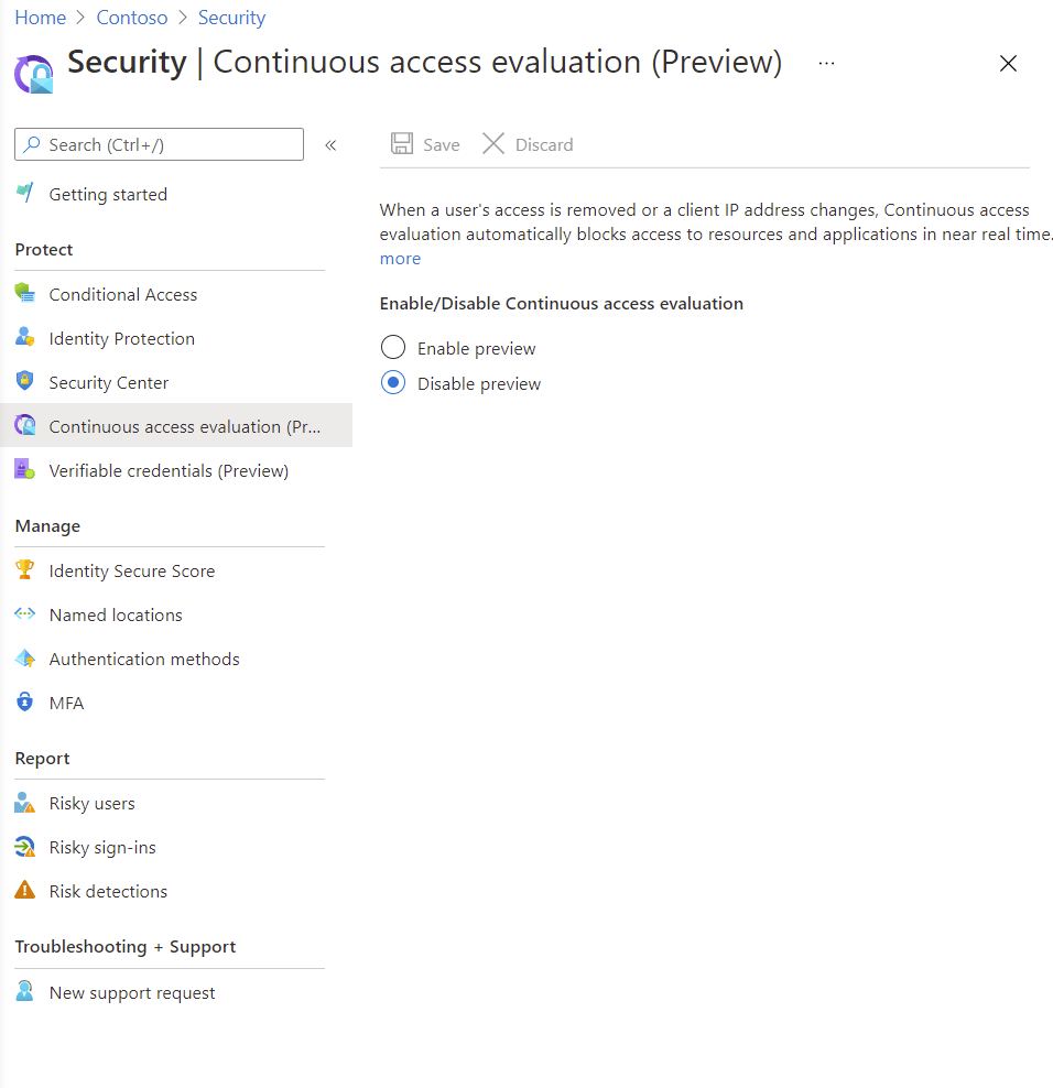 CAE was previously available to enabled in Azure AD tenants by navigating to the Azure AD Portal and opening “Security” -> “Continuous Access Evaluation” and enabling the preview.