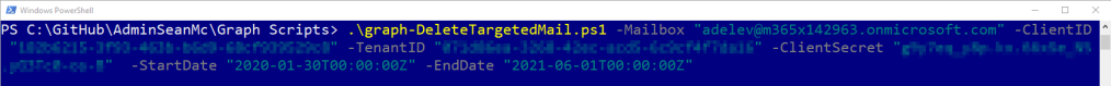 .\graph-DeleteTargetedMail.ps1 -Mailbox "adminseanmc@adminseanmc.com" -ClientSecret $clientSecret -ClientID $clientID -TenantID $tenantID -StartDate "2021-01-30T00:00:00Z" -EndDate "2021-06-01T00:00:00Z"