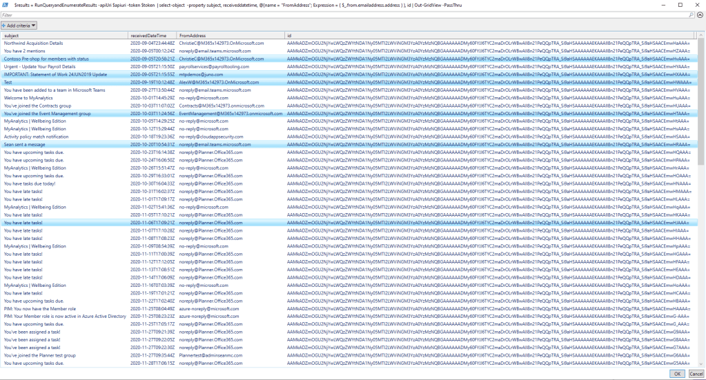 Once the script starts and searches the mailbox, the results will be shown as a Grid View. Select one or more (by holding CTRL) mails from the Grid View window as seen in Figure 3, and click “OK” to begin the delete.