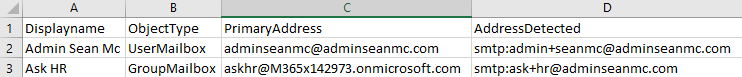 When it runs, the script returns all recipients (remember, we aren’t just looking at mailboxes here – groups too!) and checks each of them for the ‘+’ sign in the email addresses. When detected, a variable is appended to an overall collection containing the Display Name, Recipient Type Details, Primary SMTP Address and the specific address that’s assigned. This gives all the information needed to locate the usage of ‘+’ in the organization.