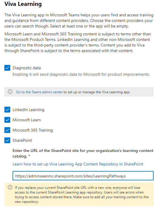I’ve previously written about the benefits of the Learning Pathways SharePoint Online site and how it can be used to facilitate training and adoption throughout the organization. As this is SharePoint based, you can also leverage any content that has been added to this site and make it available through Viva Learning. In this post I’ll go through how you can integrate the two, if you haven’t already, make sure to deploy the Learning Pathways site or another SharePoint Online site to host learning content.