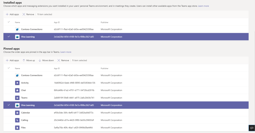 To deploy the Viva Learning app (if it’s not already deployed) create or update your App Setup and App Permission policies appropriately. This can similarly to how I deployed the Viva Connections app in this post and when complete should look similar to the App Setup Policy shown in Figure 6.