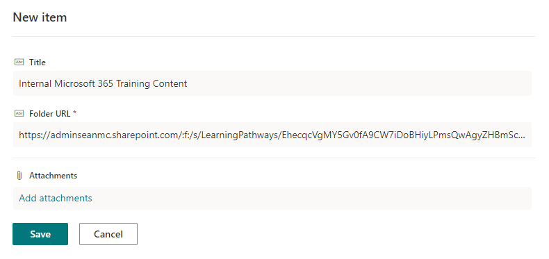 To add content, open the newly created list and add a new list entry. Give the entry a descriptive name and add the URL for the folder you want to add (Figure 5). You can add multiple folders with different names by adding multiple list items.
