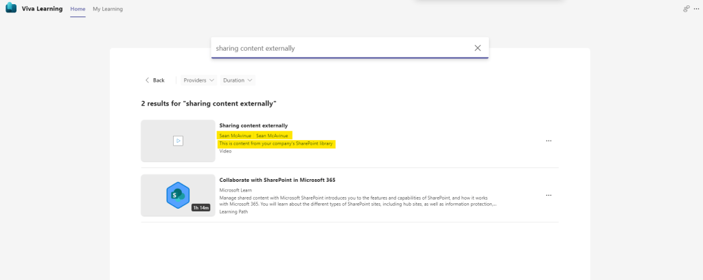 When SharePoint content is added, this can take up to 24 hours to be reflected in Viva Learning. Optionally