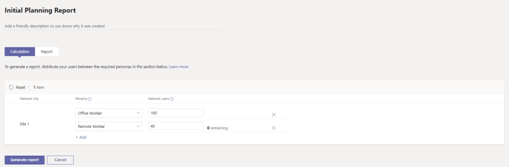 The Teams Network Planner is a tool available in the Teams Admin Center (TAC) that can be used to calculate the network requirements prior to deploying Teams across multiple physical locations. There are two components to keep in mind when using the network planner: Plans and Personas. Plans represent the configuration of physical networks and subnets and personas represent types of users (to help calculate bandwidth requirements).